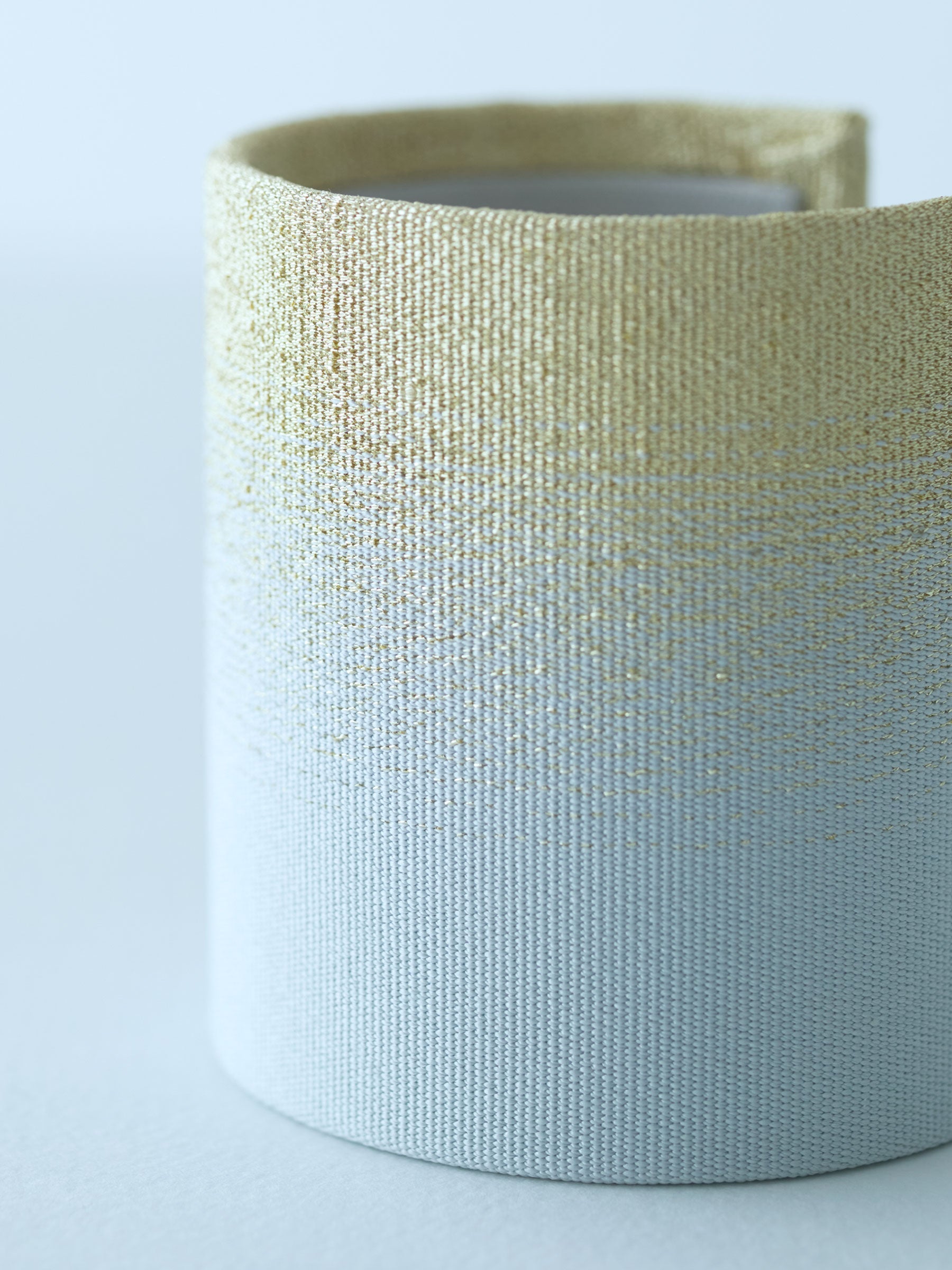 滋賀の織元、清原織物との制作による西陣織のジュエリー。 SERIES 02は産地の情景の琵琶湖をテーマにしています。刻々と色彩が変化する湖面や空、水面の反射の美しさを綴織(つづれおり)に落とし込んだ、オブジェのようなバングルのシリーズ。古来から、手仕事に願いや祈りを込め織られてきた織物は、お守りのような存在です。水面のきらめき、揺らぎを紋様として表現した、シルバーやゴールドのジュエリーも展開しています。